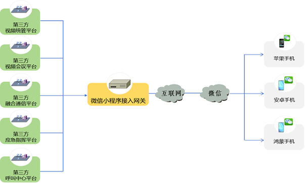 CK-WXG微信小程序接入网关是对接微信平台的特种网关,为第三方业务平台(如视频会议、监控、融合通信、应急指挥、呼叫中心等)提供个人手机用户的微信视频调度能力,兼容安卓、苹果、鸿蒙系统。该网关适用于基层治理、能源、交通枢纽、医院、养老机构、校园、景区、园区、港口、机场、电厂等领域的免APP视频指挥调度场景,实现调度系统与微信端的高效通信。